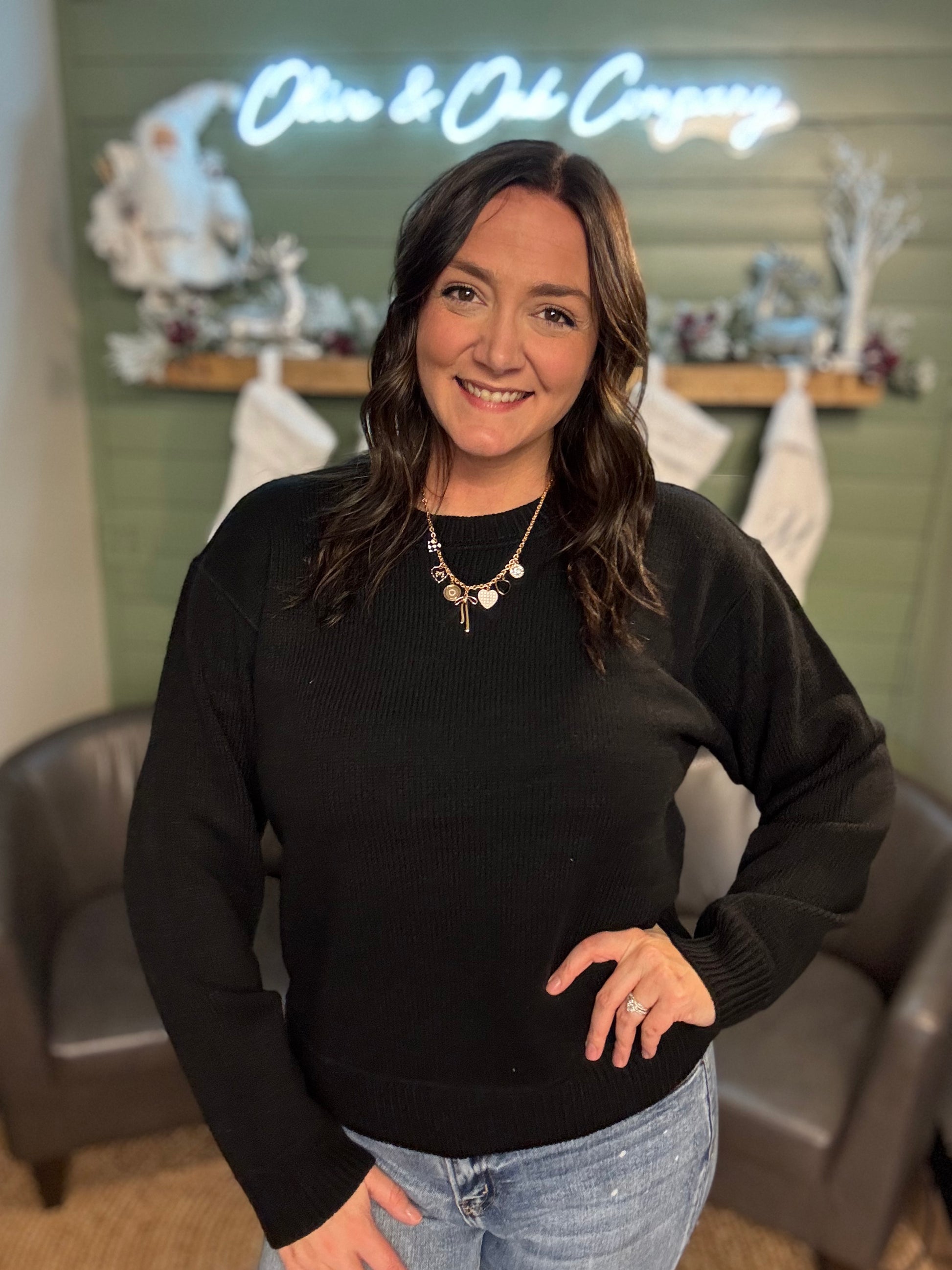 Basic black sweater thats perfect for casual wear and dressing up for any occasion. Fits relaxed and true to size.
