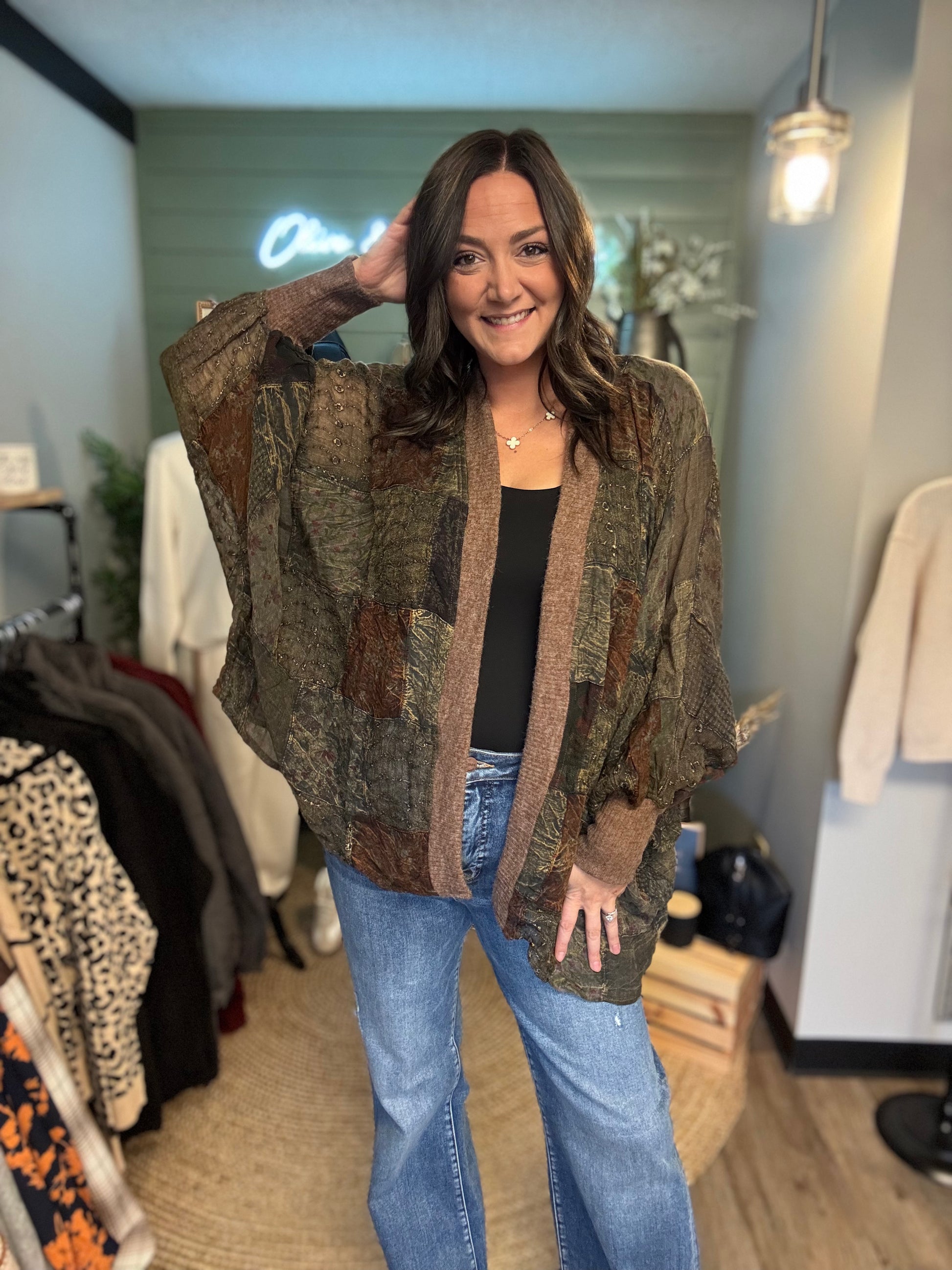 The Amber Kimono is a striking vintage-inspired patchwork piece that transforms any outfit into a bold fashion statement. Crafted from carefully curated fabric patches in warm, earthy tones, this kimono features an artfully asymmetrical design that celebrates individuality and creative style. The flowing silhouette drapes effortlessly over dresses, jeans, or layering pieces, while the intricate patchwork detailing adds depth and character that mass-produced pieces simply can't match. Perfect for those who refuse to blend in, this one-of-a-kind kimono elevates your wardrobe with vintage charm and undeniable presence.