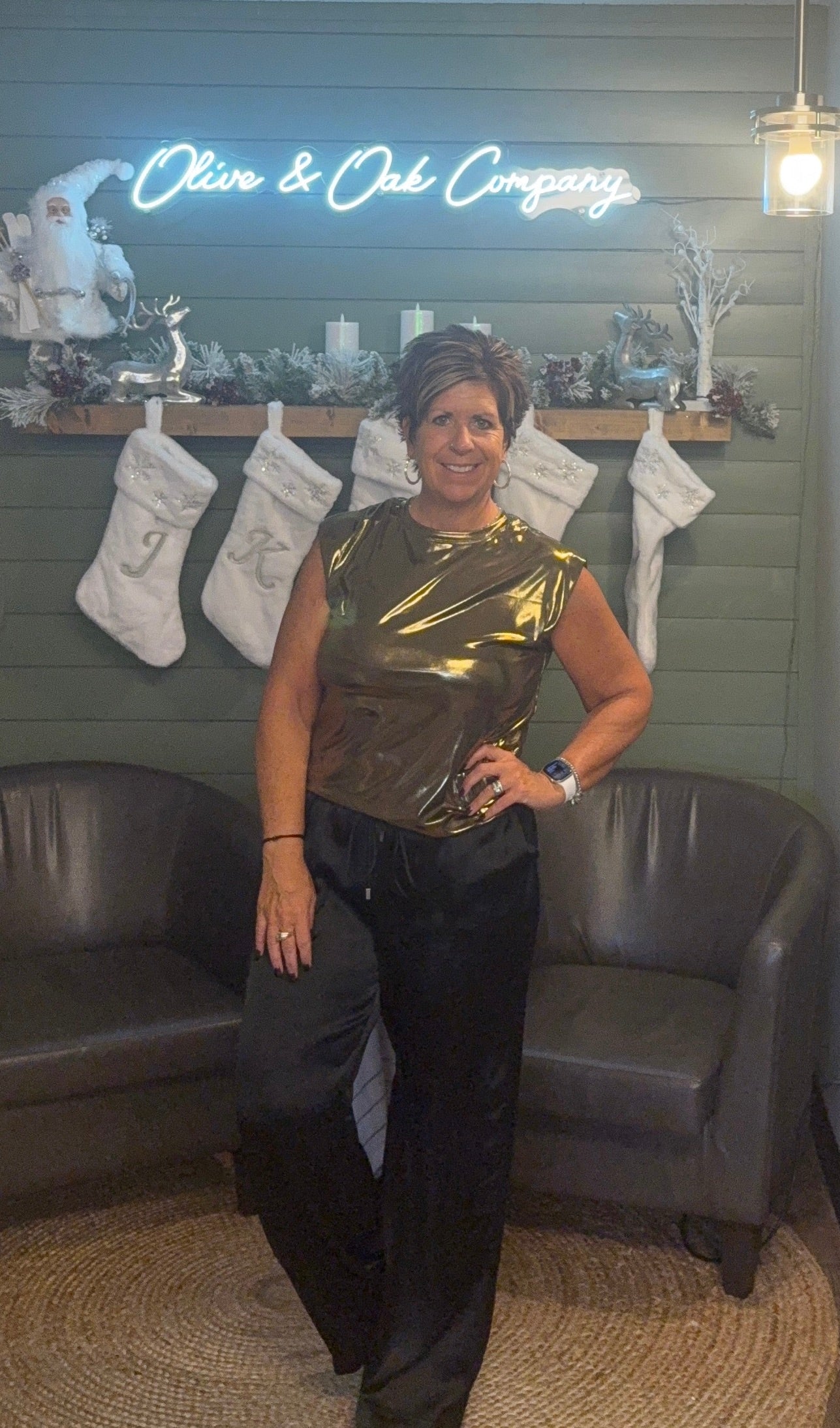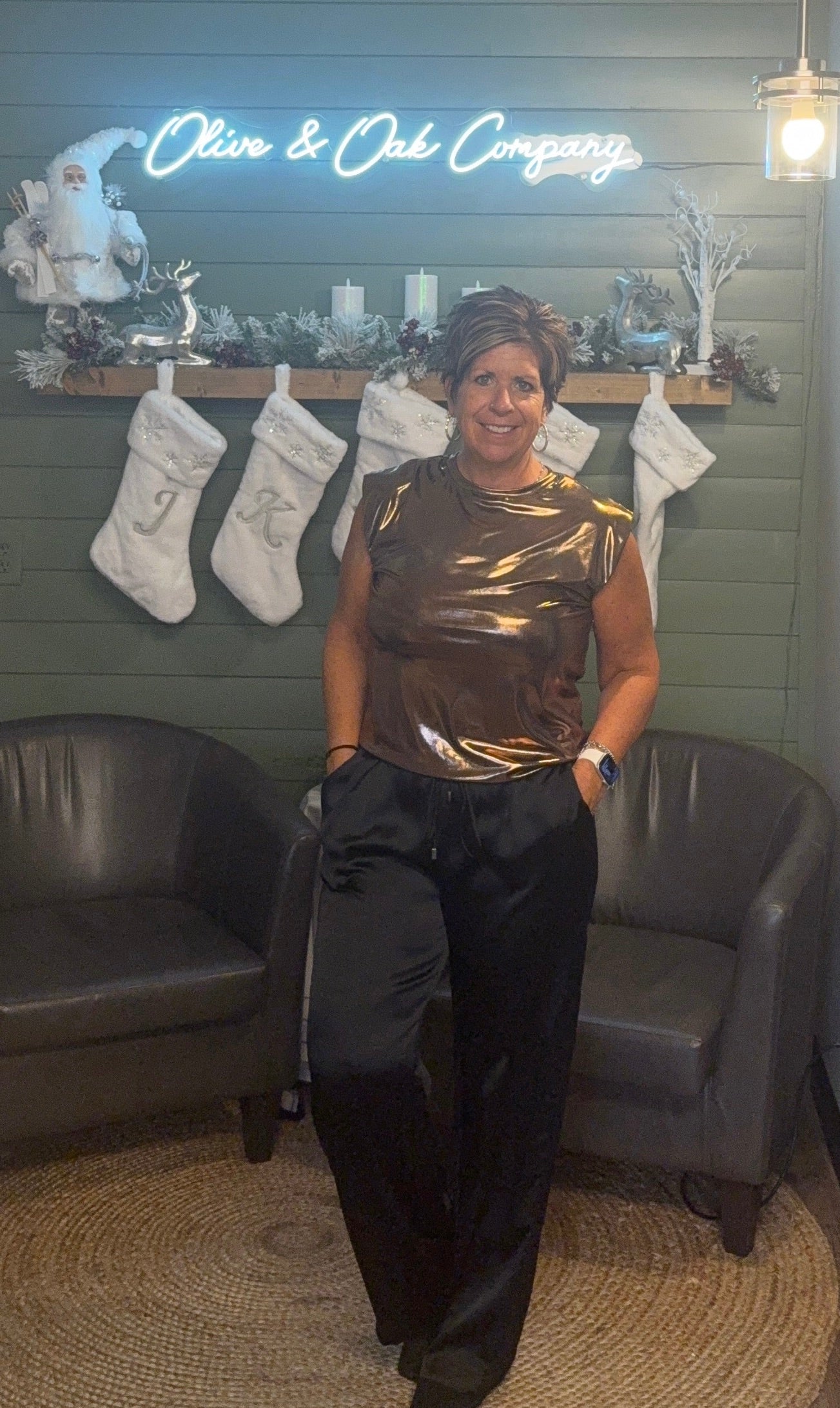 The Aspen Top brings effortless elegance to your holiday wardrobe. This sleeveless metallic blouse catches the light beautifully, making it an ideal choice for festive gatherings and special occasions. The shimmering fabric adds a touch of glamour to any outfit, while the classic silhouette ensures versatility season after season. Fitting true to size, it's ready to become your go-to piece for celebrations and beyond.