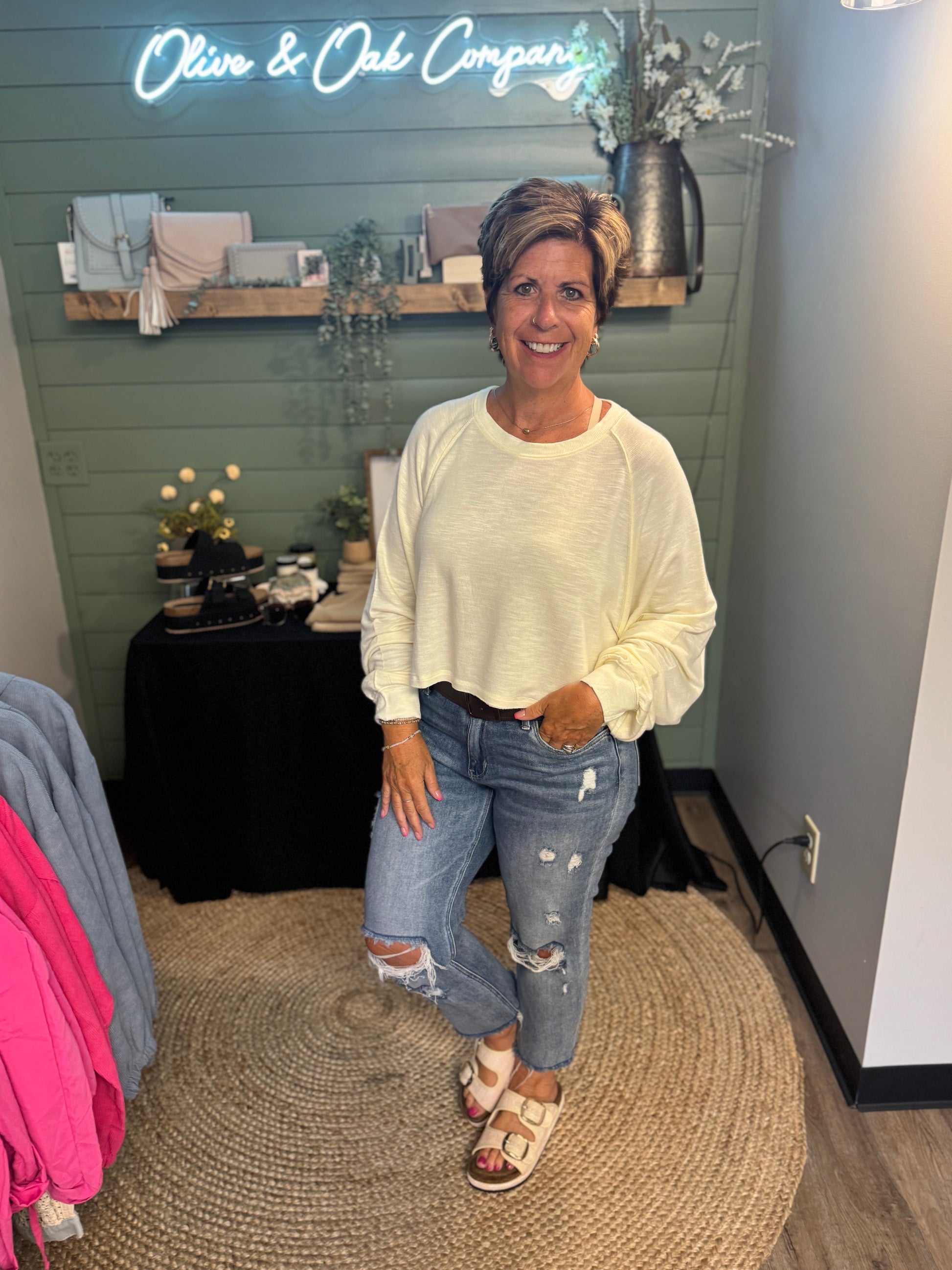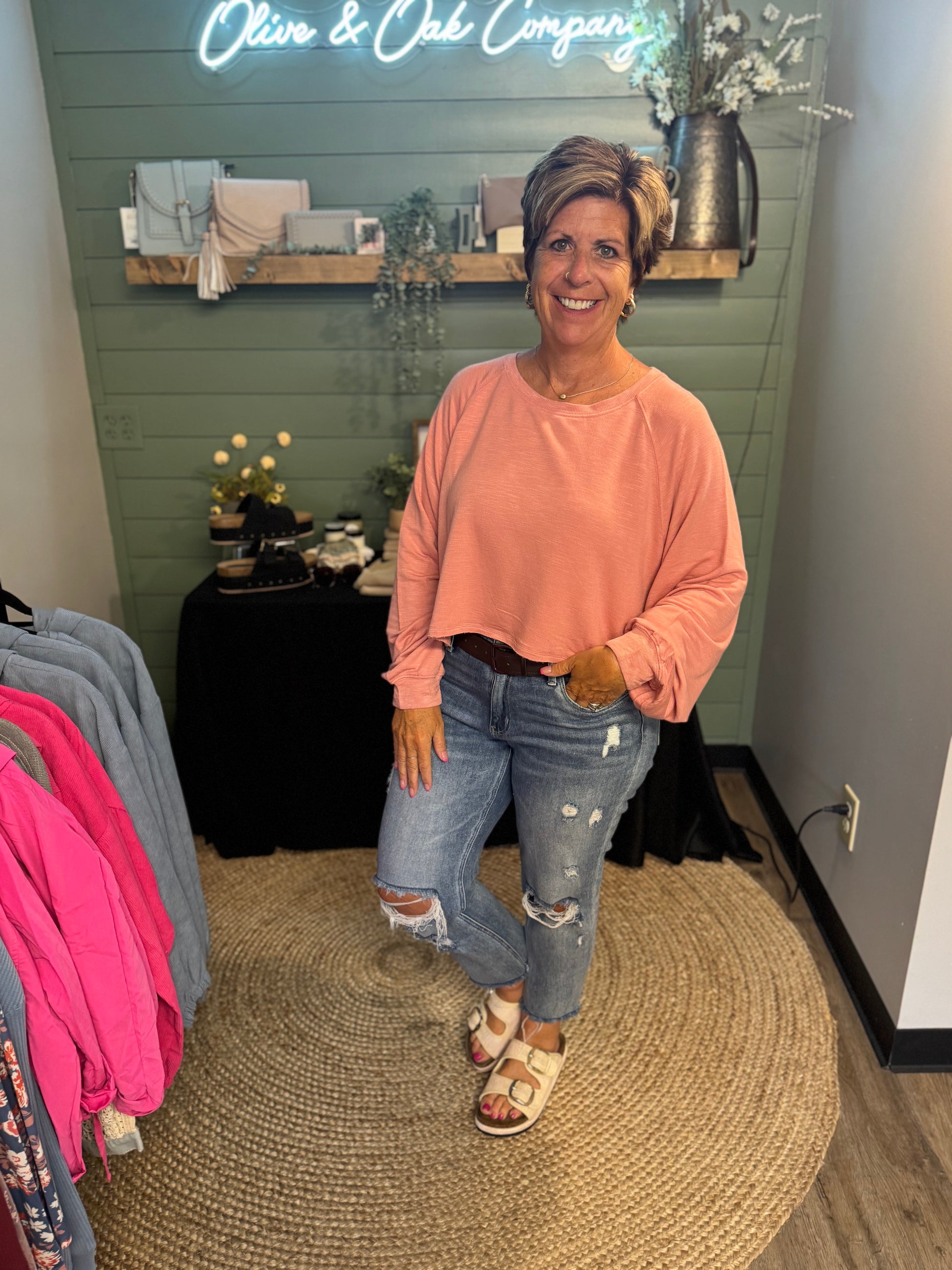 An adorable cropped long sleeved top that's lightweight and is perfect for transitioning into fall! Wear with your favorite jeans or leggings! Fits relaxed and true to size.