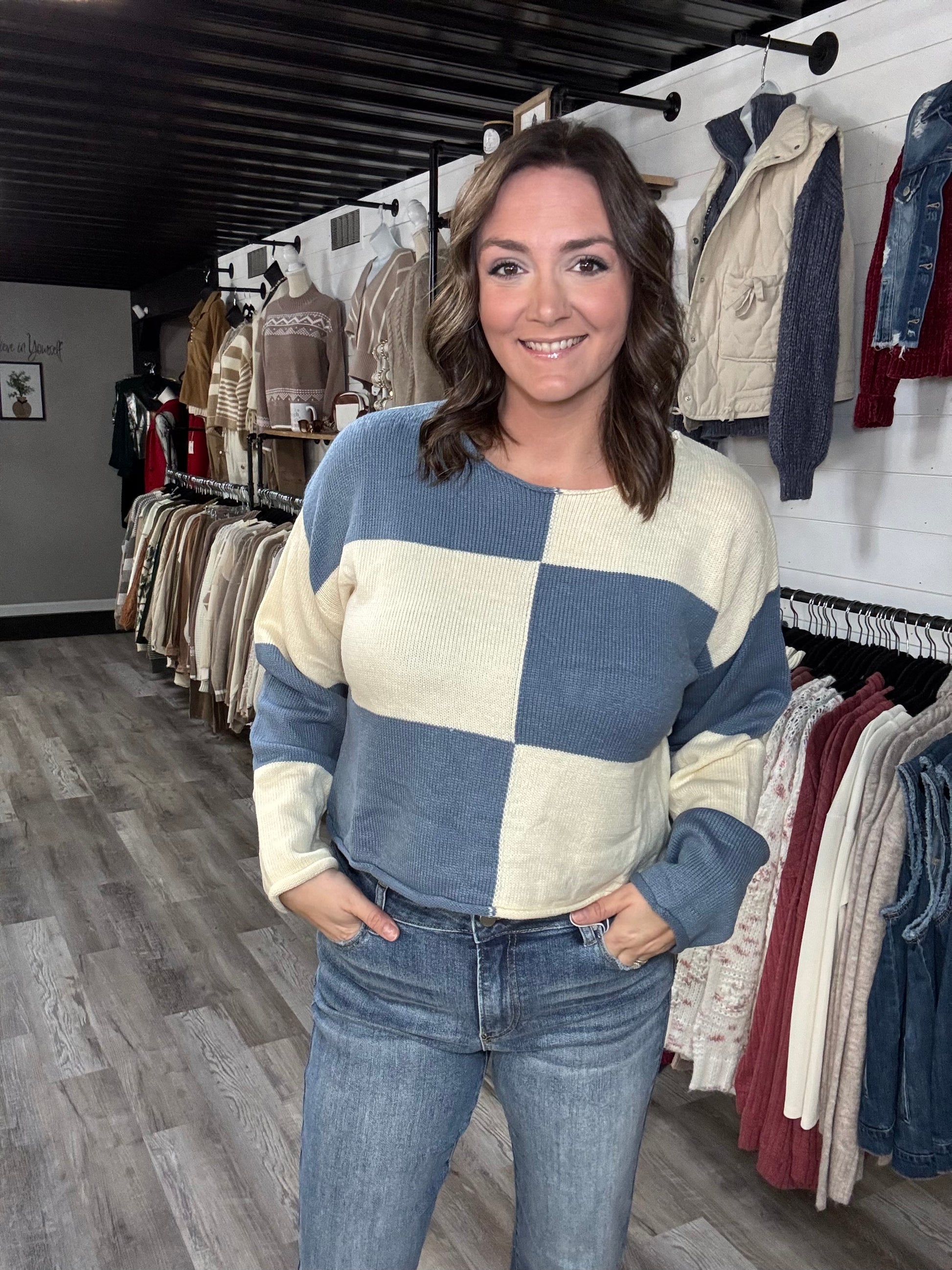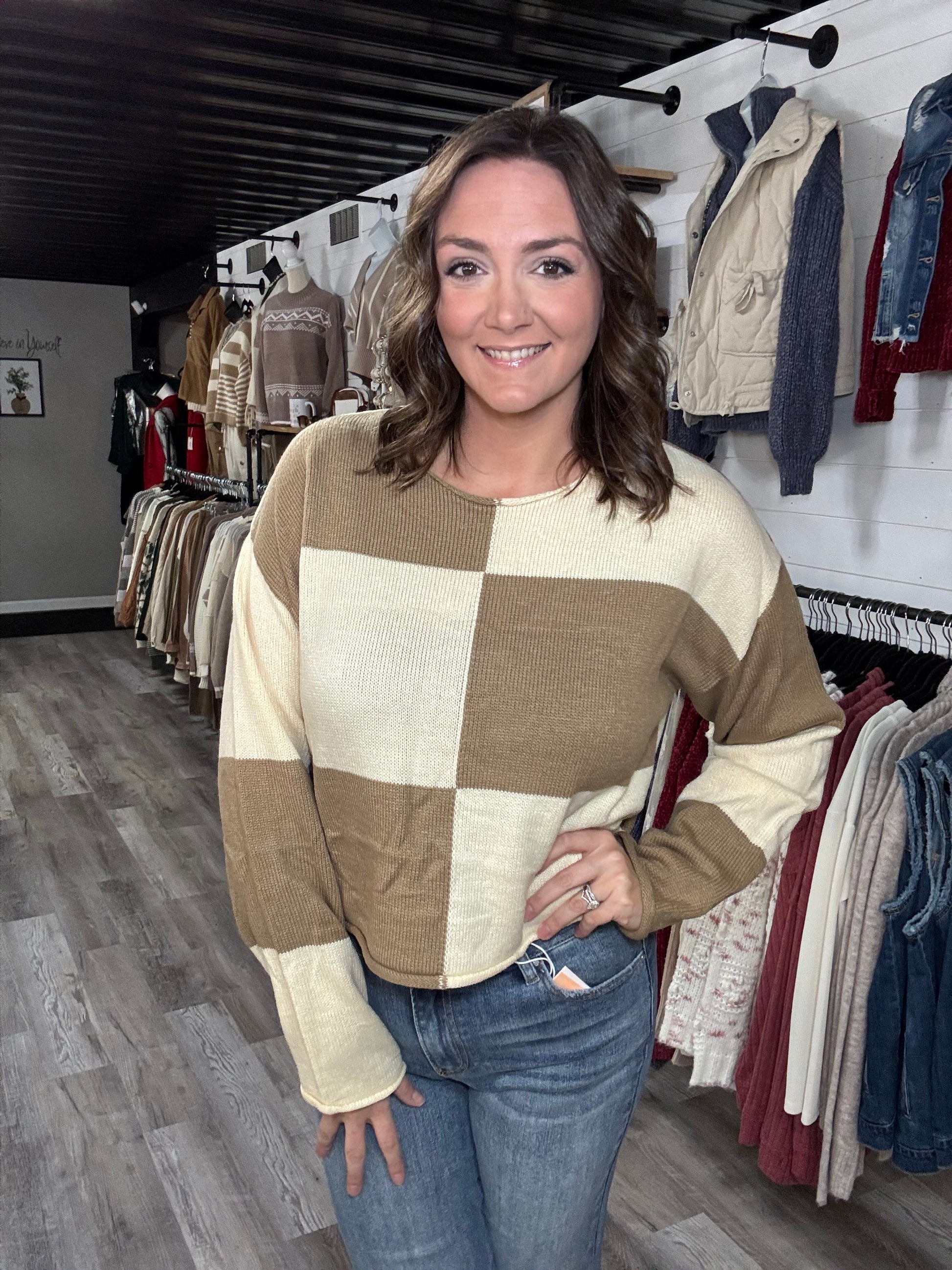 Stay on trend with this adorable look fit rolled hem checkered sweater! Fits relaxed but tts.
