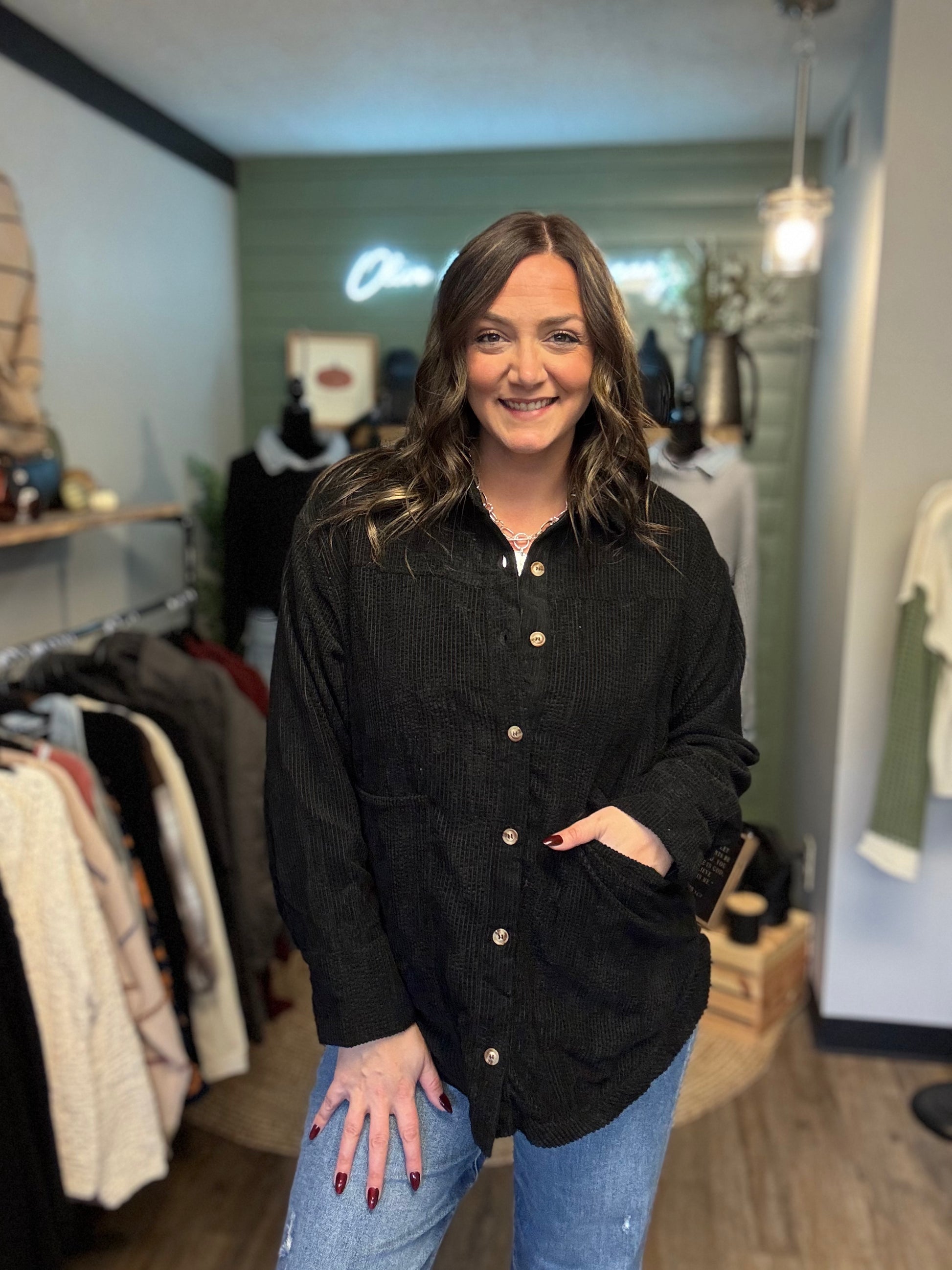 The Ellie Corduroy Shacket is your go-to layering piece for effortless fall style. Crafted from soft corduroy, this versatile shacket features a classic black button-down design and functional front pockets—perfect for keeping your essentials close while you're on the move. Whether you're dressing it up over a dress or pairing it casually with jeans, The Ellie transitions seamlessly from season to season. Cozy enough for crisp autumn days, polished enough for any occasion.
