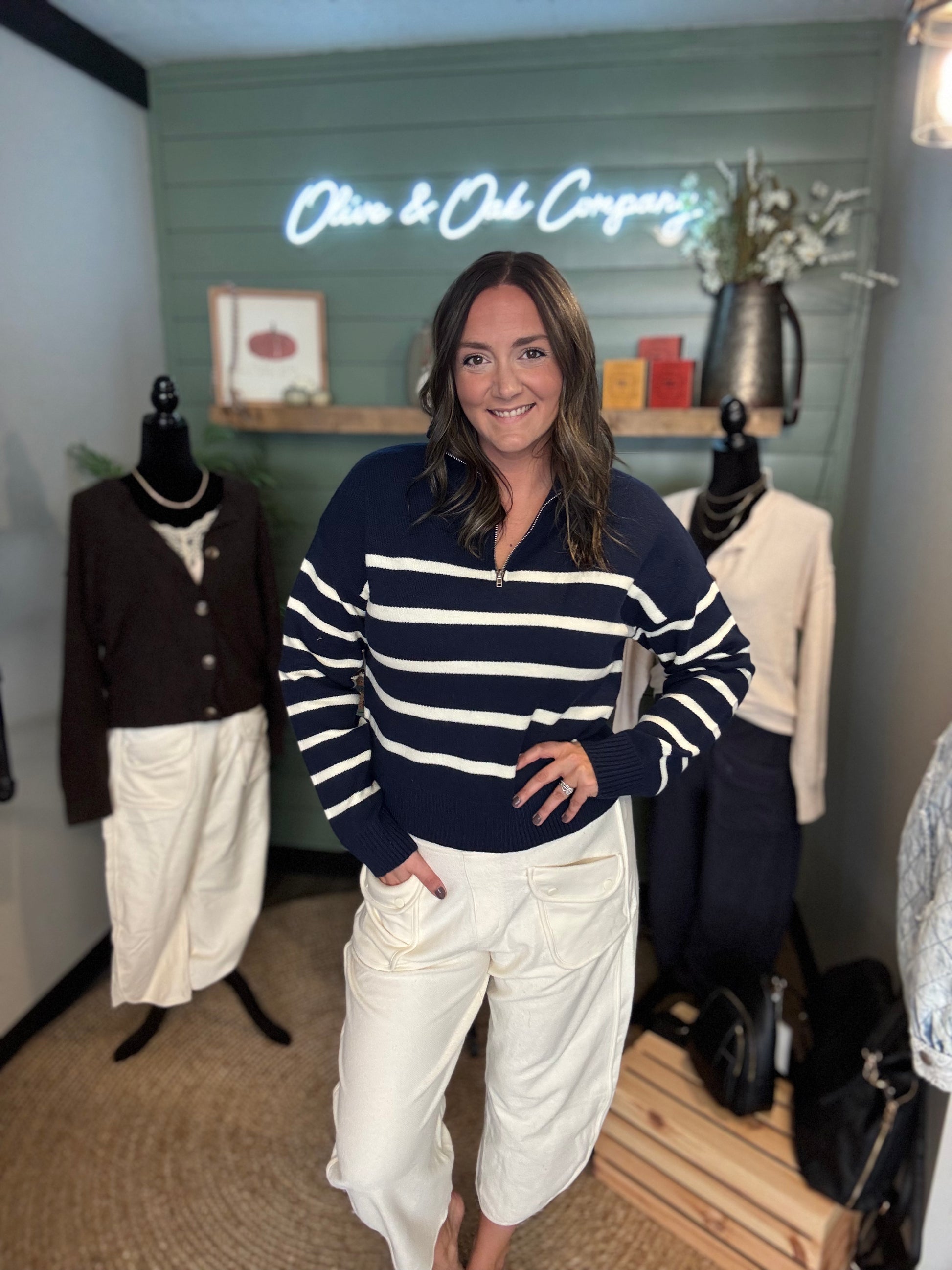 The Hayley Sweater is a navy striped quarter zip pullover designed for effortless fall style. Its relaxed fit stays true to size, offering cozy comfort without losing shape. Perfect for layering or wearing on its own, this sweater combines classic stripes with versatile warmth to enhance your seasonal wardrobe.