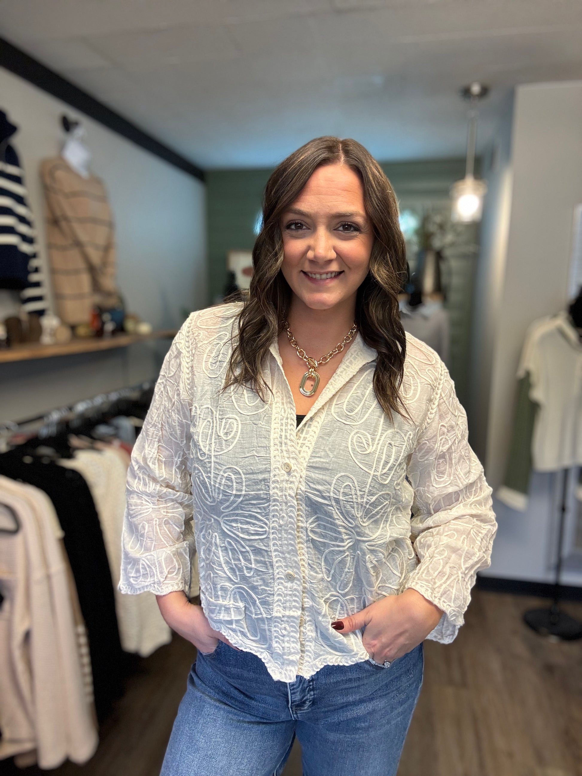 The Layton Top is a versatile long-sleeved crochet shirt featuring delicate floral embroidery that elevates any wardrobe. Crafted by POL Brand, this one-size-fits-all design offers effortless comfort and style for various body types. The intricate crochet detailing and embroidered florals create a romantic, textured look perfect for layering or wearing solo. Whether you're dressing up for an occasion or keeping it casual, this timeless piece transitions seamlessly from season to season, making it an essential addition to your closet.