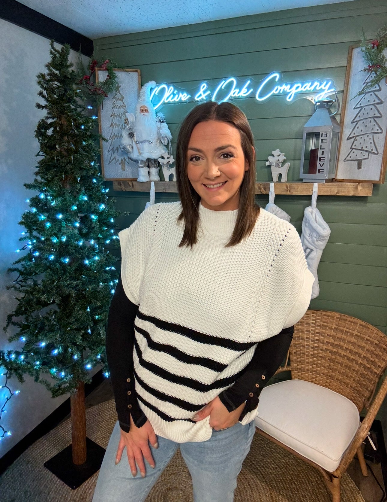 Ribbed knit striped mock neck cap sleeved sweater. Fits relaxed and over sized.