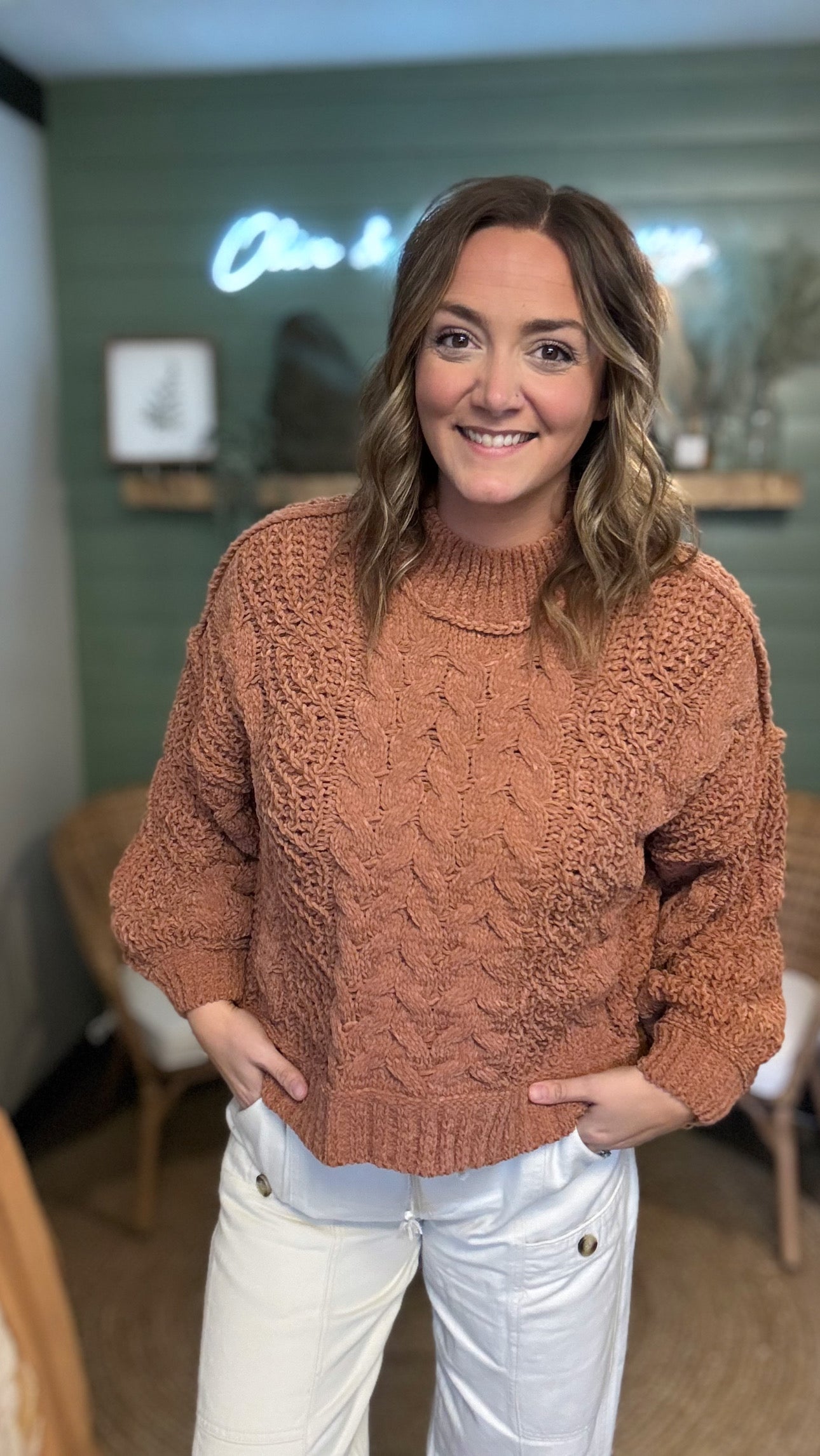 A beautiful mid weight calle knit sweater with mock neck design and balloon sleeved.