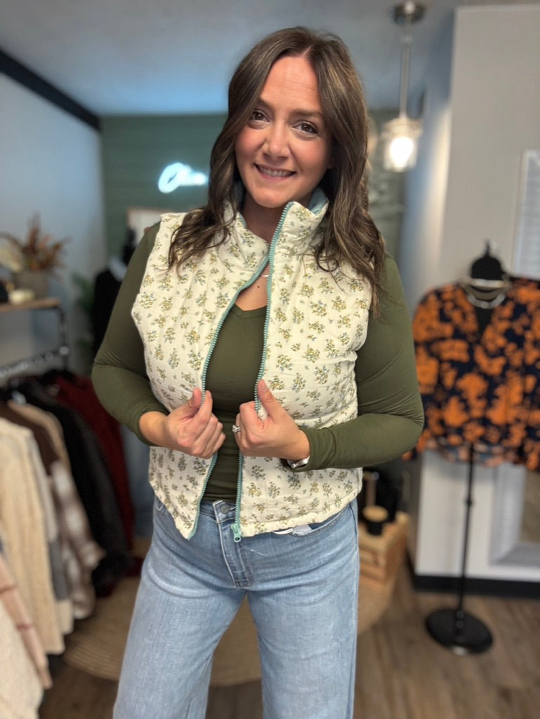 The Millie Puffer Vest features a charming floral print and a cropped silhouette that elevates any fall outfit. With a convenient zip-up front and handy pockets, it combines style with practicality. It’s the ideal layering piece to keep you cozy while embracing autumn’s crisp air.