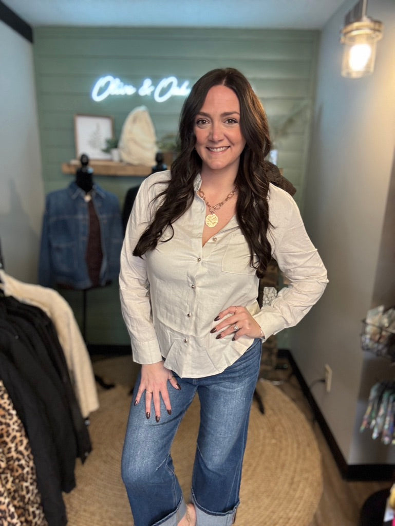 The Romy Button Up combines timeless oxford styling with modern comfort. Crafted from a breathable linen blend, this relaxed-fit shirt features functional pockets and elegant gold-detail buttons for an effortless, polished look. True to size and versatile enough for casual weekends or dressed-up occasions, it's the perfect addition to any wardrobe.