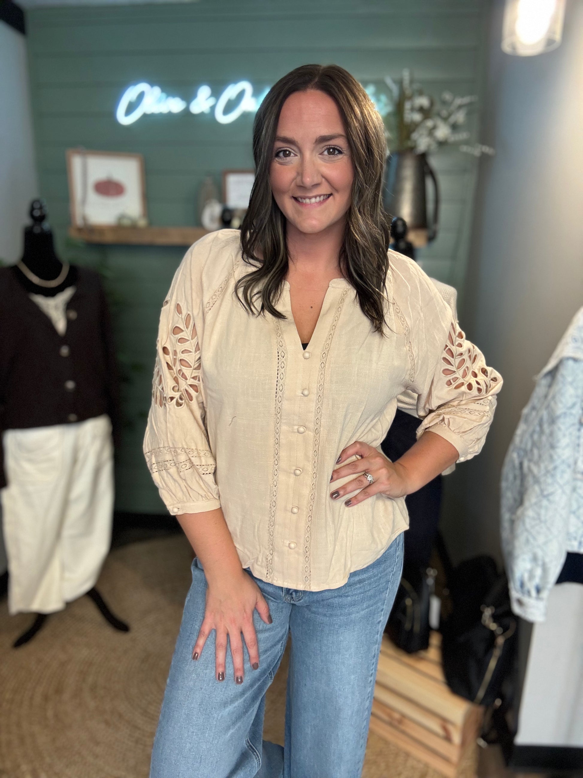 The Shelly Top features charming eyelet detailing and a relaxed fit that offers comfort without sacrificing style. Its three-quarter length sleeves create a flattering silhouette, making it perfect for both casual and dressier occasions. Designed to fit true to size, this top combines easy elegance with effortless wearability.