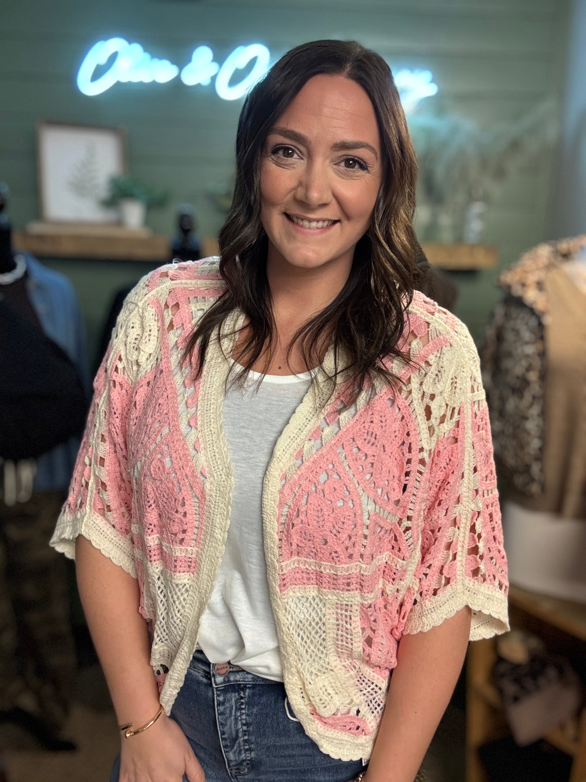 The Taylor Cardigan is the effortless layering piece your wardrobe has been waiting for. This relaxed-fit crochet knit cardigan drapes beautifully with an open front design, perfect for throwing over your favorite tee or dress. Delicate pink detailing adds a touch of warmth and personality to this versatile essential. Whether you're dressing up or keeping it casual, The Taylor delivers comfort and style in one cozy package.