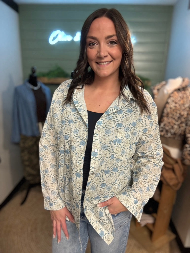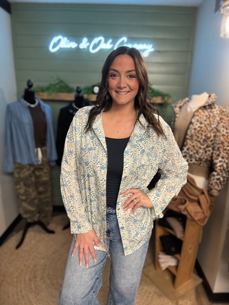 The Cali Top brings effortless elegance to your everyday wardrobe. This long-sleeved button-down blouse features a vibrant floral print on soft, breathable woven fabric that drapes beautifully. The classic collared design and structured fit make it perfect for layering or wearing solo—dress it up for the office or down for weekend outings. Versatile, comfortable, and timelessly stylish, this piece is a must-have addition to any closet.